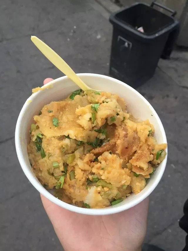 这个土豆泥也要说!!!在美食街里!就叫土豆泥。。炸的土豆里面有酸豆角 香菜那些