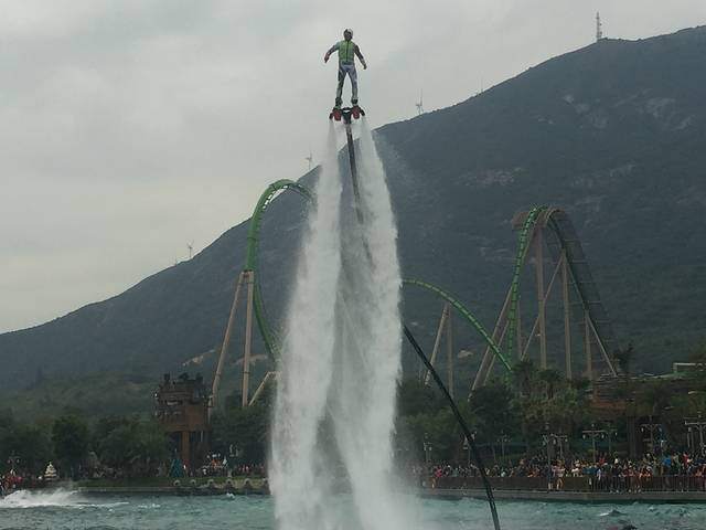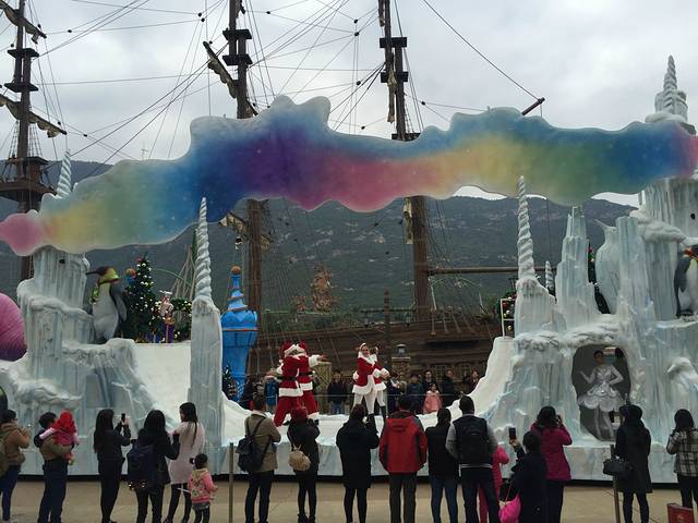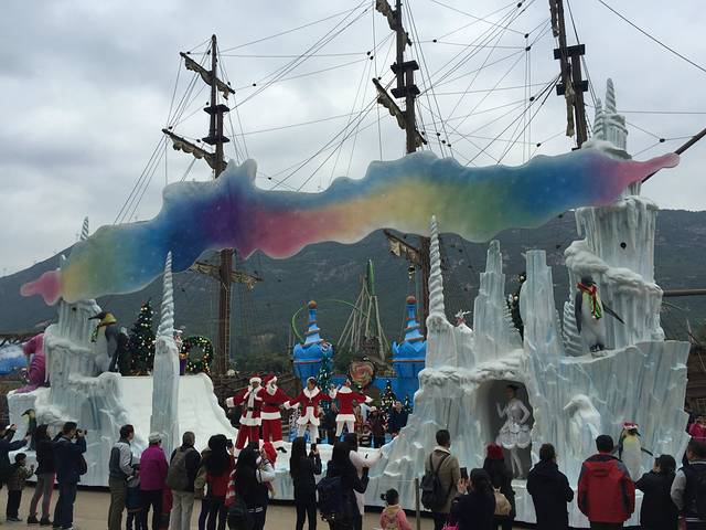 长隆里最大的一亮点不止是小动物和游乐设施,还有我们的巡演,比如:跳跃旋律音乐喷泉、烟花幻彩横琴海、海洋大巡游、海洋星光舞会。。。等等。这里我要跟大家分享的先是海洋大巡游:这个是大概下午15:00分开始,因为临近圣诞节吧,全程都是欢快的圣诞主题的音乐,好多辆花车依次排开出行,每个花车都是一个主题,车上有配合主题的舞装人员向我们挥动手打招呼,花车的前方和后方也均有表演人员和工作人员组成一支小方队。最记忆深刻的是:很多国外的演出人员参与,还有小丑扮演人员与场边的游客玩游戏,然后派发小礼物,将场面带得很嗨!其次要与大家分享的是【跳跃旋律音乐喷泉】,这个是在下午16:00开始的,还真的很厉害的,当时我在观看的时候就拍了很多小视频发朋友圈,点赞的朋友都很多,这个表演均由外国的朋友来完成的,全程有4个玩海上摩托艇,他们的组队的位置和换位的表演都让摩托艇后延伸的水花形成一道道美丽的弧线,几道水花交织在一起就像天空下起的流星雨,很美!另外一边还有两位表演者,在给自己穿上好装备后,就一跃而起,脚踩下方喷泉腾空站立以及表演着各种花式动作,音乐+水面的水花弧线+腾空鱼跃的表演者,这简直是一副非常动感且令人兴奋激动的画面,真是开了眼界,以前在电视上才能观摩的,如今真是不虚此行!
