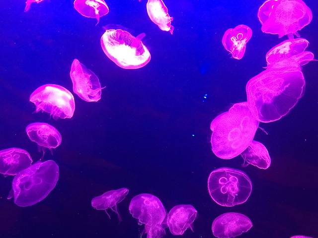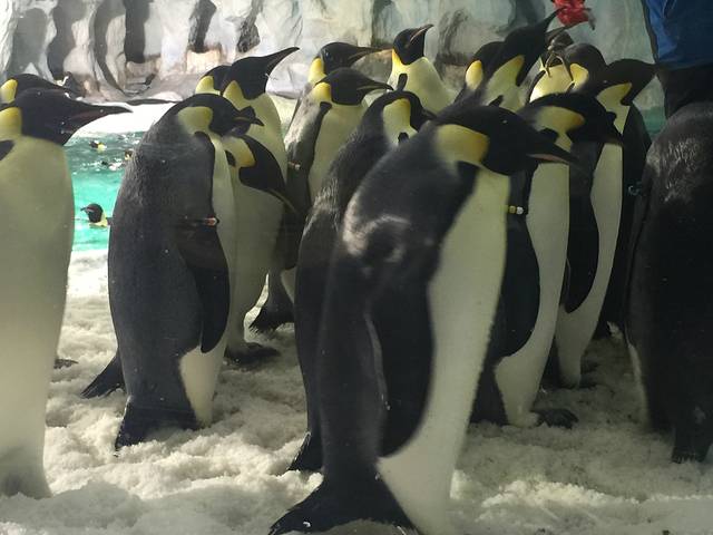 赶在圣诞节前夕,海洋王国布置得也是很有圣诞气氛,到处可见圣诞树及小叮当。。。等等。一进园区可见一个海洋大街超大的魔鬼鱼造型LED天幕,这里呈现的是海底世界各种逼真的海洋动物。再进去便是这梦幻般的海底世界,看看这结伴而行的海豚,活泼着四处游来游去的鱼儿,闪着五颜六色的水母。。。都是一幅幅美丽的景象,仿佛自己已经潜水在这深海处,忘却周边嘈杂的人群,只身跟随着这些调皮而又美丽的小动物们游玩嬉戏,又与它们共舞一直美丽的水底芭蕾。。。。。看完了海底世界,我们再看看这些可爱的路面动物,包括这一群群可爱的QQ,我当时就发了一条朋友圈:“好多QQ”,点赞评论的人也蛮多的。都被这些可爱的企鹅QQ给吸引了。拍摄这张图片的时候,正是饲养员在喂食,企鹅们都依次排队跟随着饲养员。最好玩的是,个子身材不高的偏小的企鹅,虽然挤不进去抢占比较好的位置,可是他们在外围也会有经常性的捡漏,我周围的游客都一片欢声笑语。