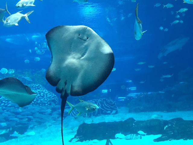 一进园区可见一个海洋大街超大的魔鬼鱼造型LED天幕,这里呈现的是海底世界各种逼真的海洋动物。