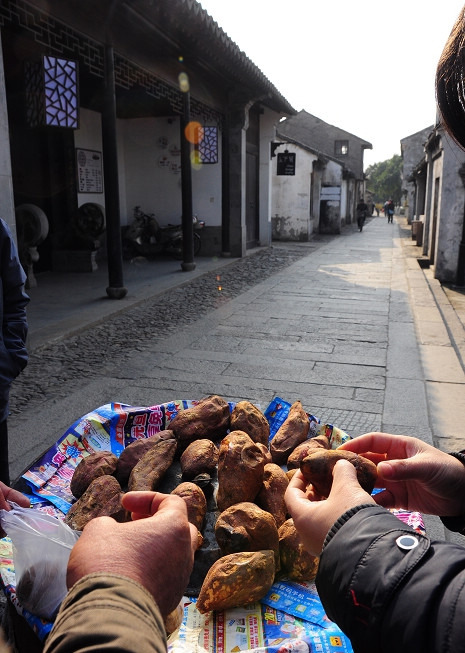 小街上有卖红薯的小贩在卖烤红薯。据说是苏州乡下本地的红心红薯,烤的黄黄的,热乎乎的,味道很香甜。边吃着刚出炉的红薯,边逛着平江路,也是种很难得的享受。