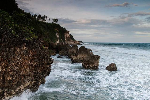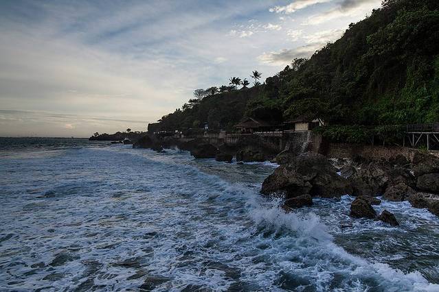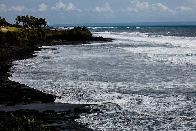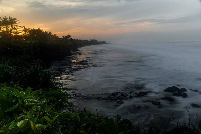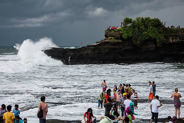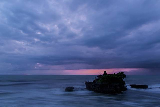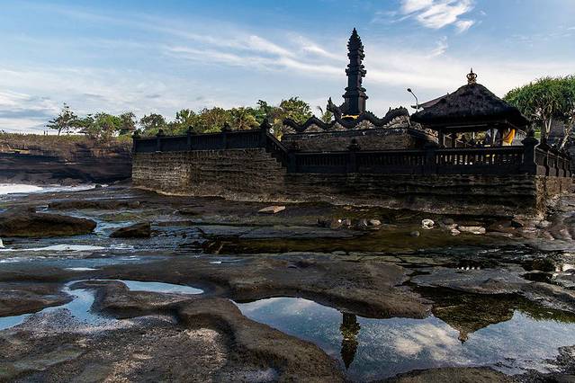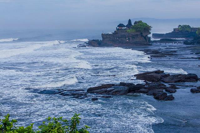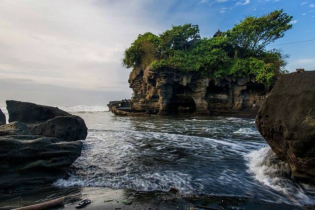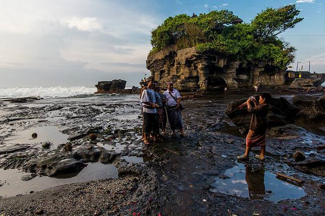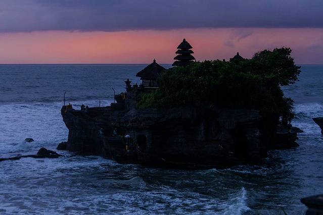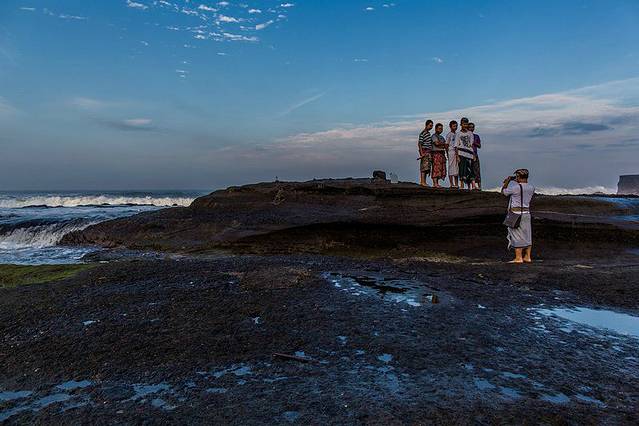 海神庙(TANAH LOT)建于16世纪,坐落在一块巨大的海岩上,涨潮的时候四边环水,只有在退潮时才与陆地相连