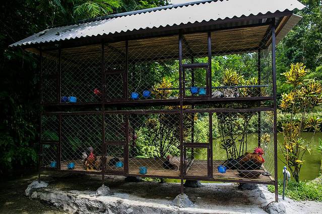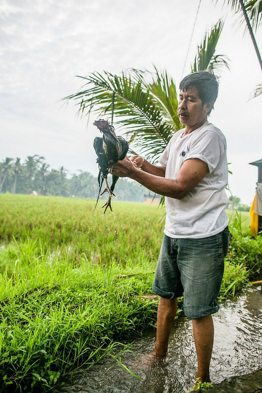 这位村民在给他的斗鸡洗澡
