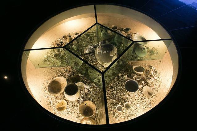 大堂里的地台,里面应该是当地出土的古代陶器。