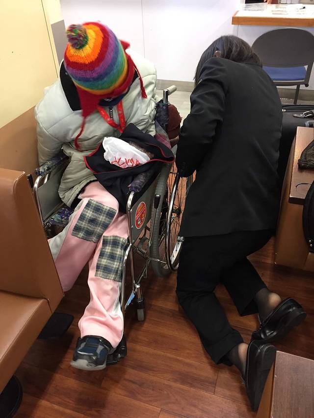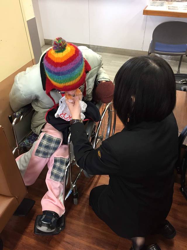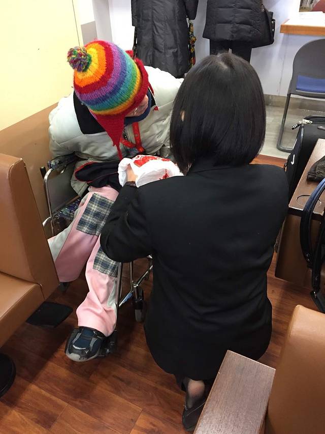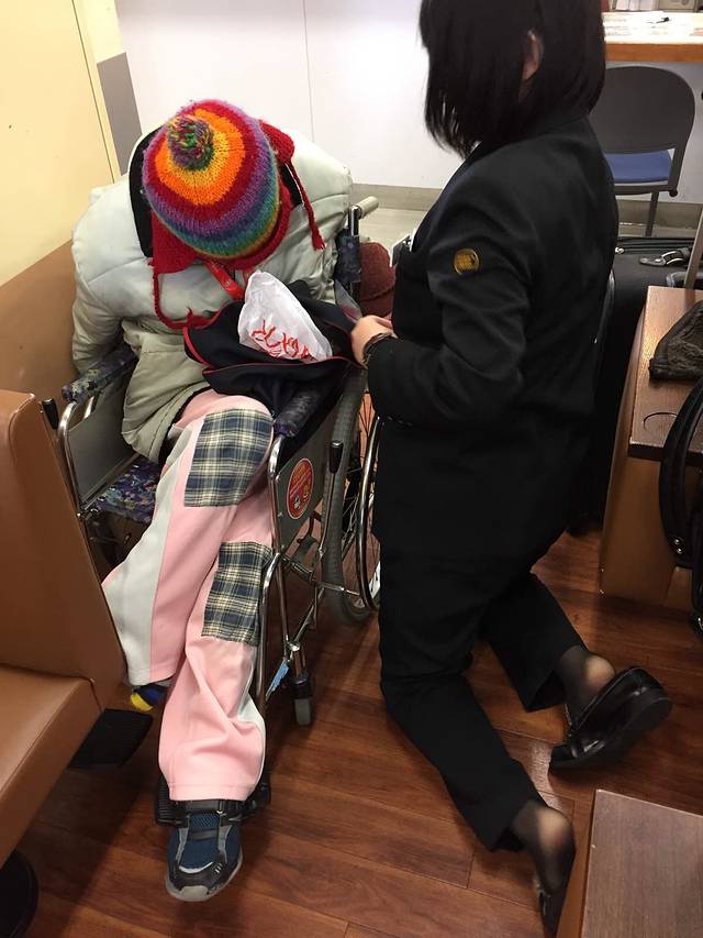 车站工作人员正在照顾不能自理的乘客