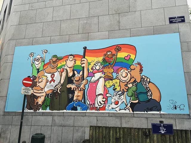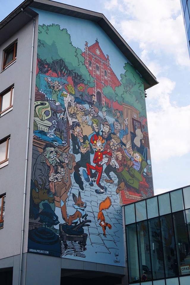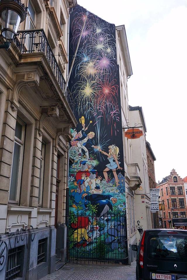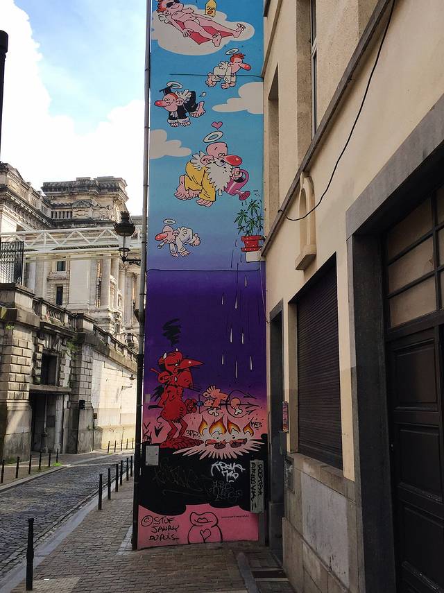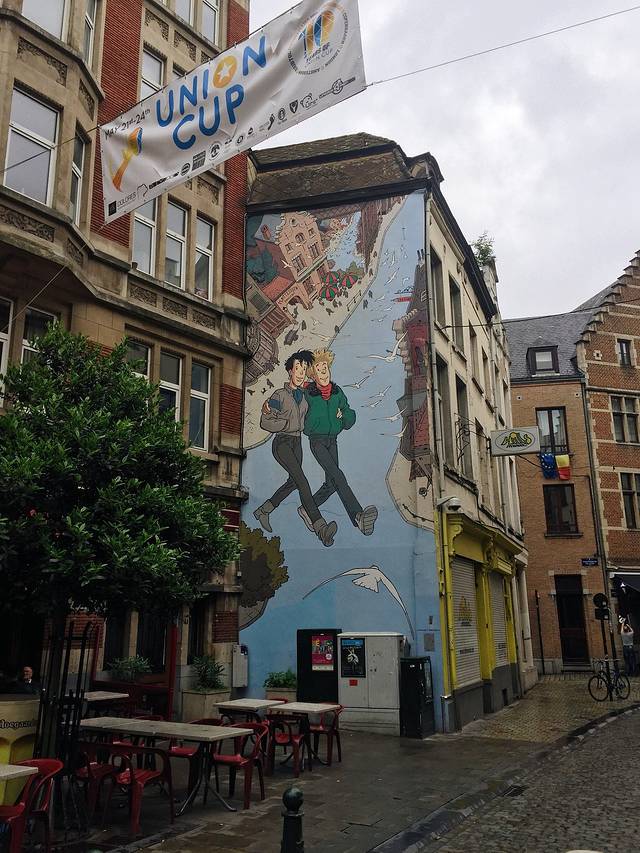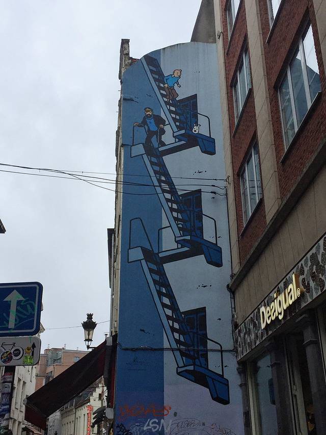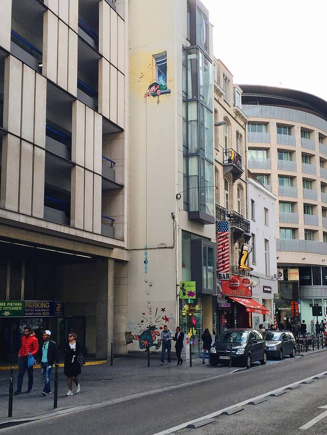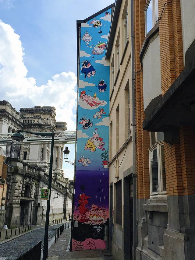 但是这次来时间并没有留时间给漫画博物馆,所以我就待在市中心去寻找平常巷陌里的漫画墙了。关于能在哪里找到这些漫画墙,可以参考布鲁塞尔旅游局官方提供的漫画墙地图。漫画墙光是大广场西南边近处就有好多个,许许多多还和当地建筑物巧妙地合而为一。