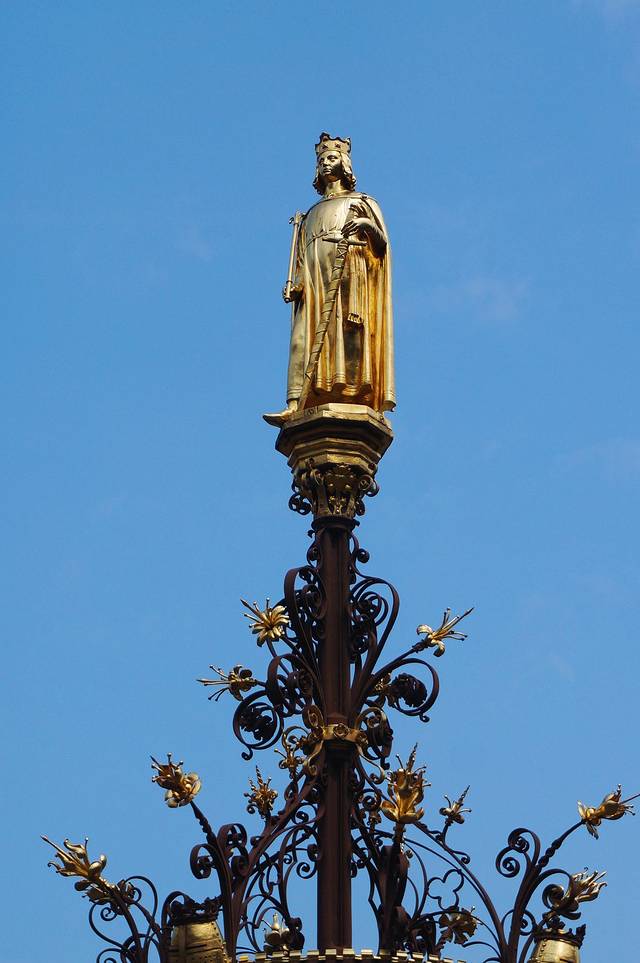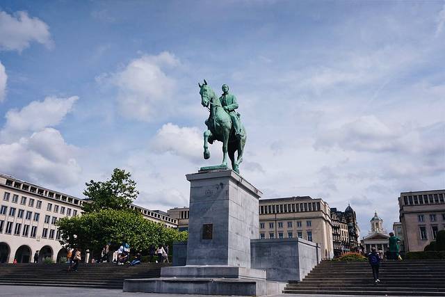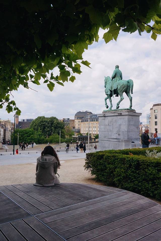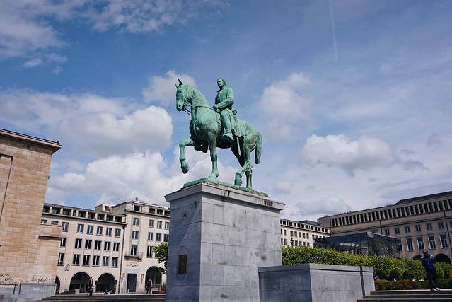 在艺术丘的最底端,是一座青铜的巨大雕塑,这个骑士正是比利时第一次世界大战的民族英雄——比利时第三任国王 Albert I。和这个骑士隔街相望的还有一尊老妇人的雕像,这个老妇人则是国王Albert I的妻子皇后Elisabeth,两个都精准地站在 Mont-des-Arts指向高丘皇家教堂的中轴线上,这组就是国王皇后纪念雕像 (Albert I & Elisabeth)。