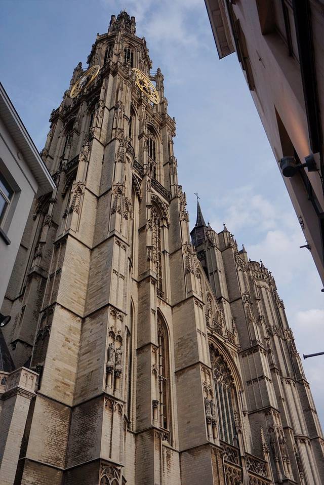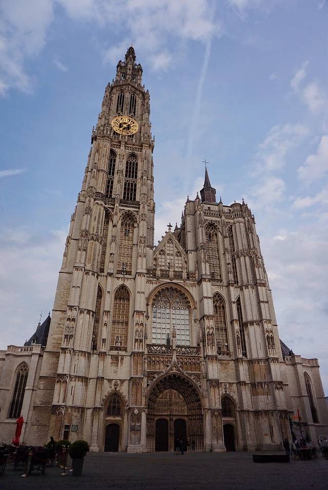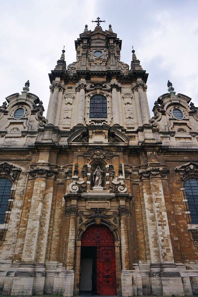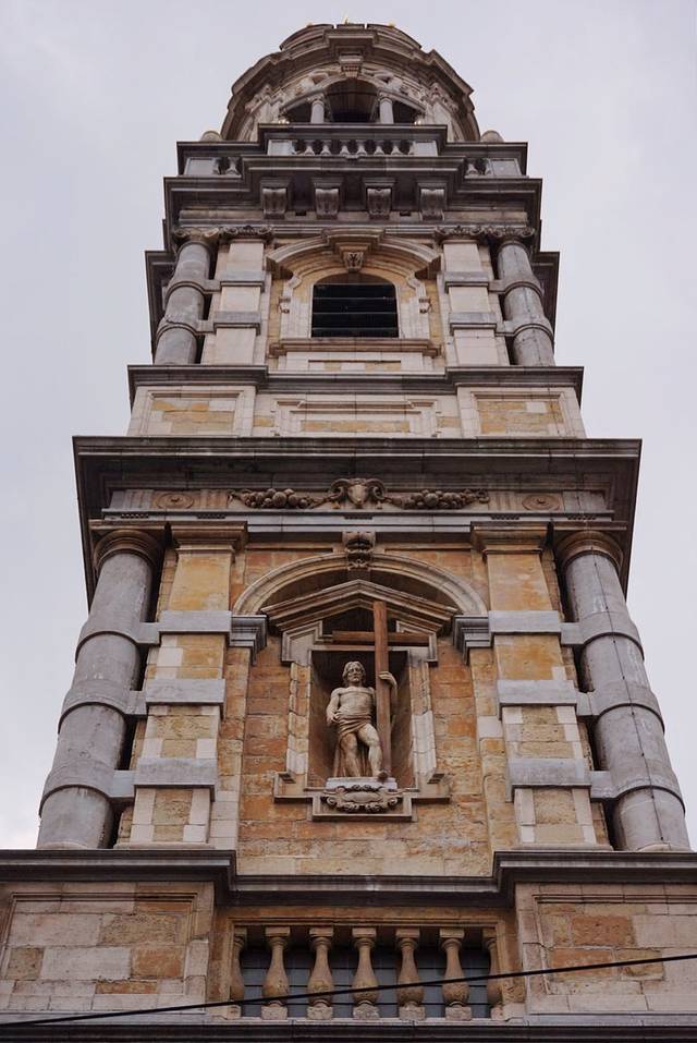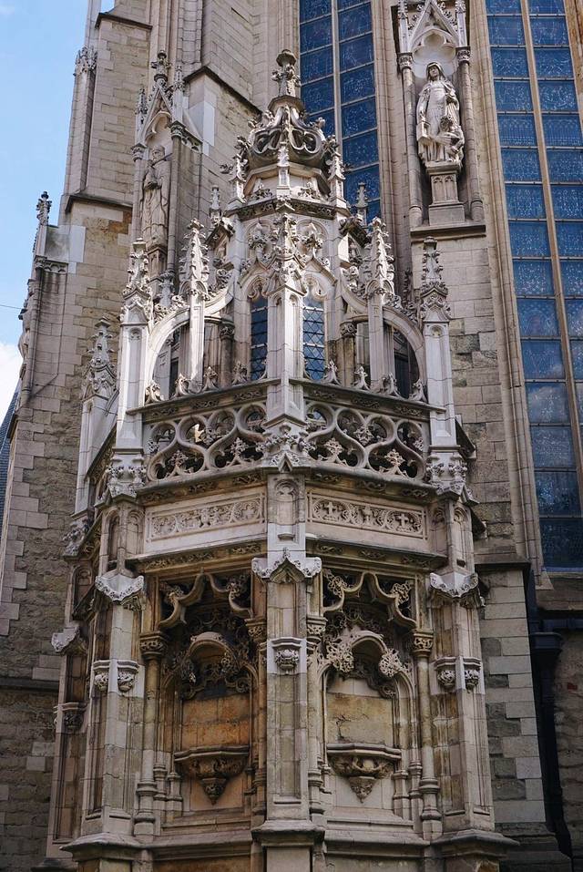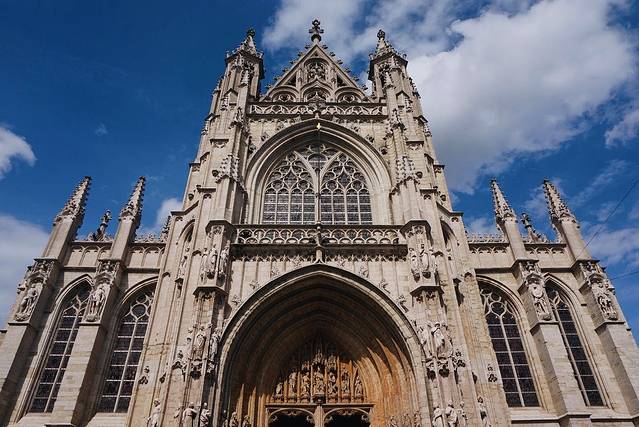 和在欧洲看到的其他哥特式教堂(比如巴黎圣母院、甚至布鲁塞尔的圣凯瑟琳教堂)不一样,大萨布隆圣母堂的正立面并没有一座高塔。可是和上面提到的歌特式教堂一样,教堂的正立面同样装饰华丽,大小雕像密密麻麻的装饰着正立面。