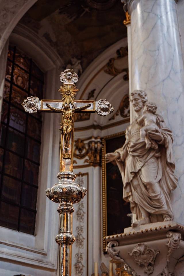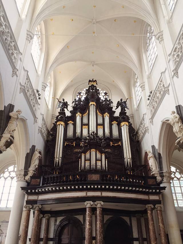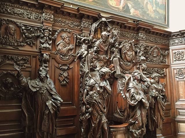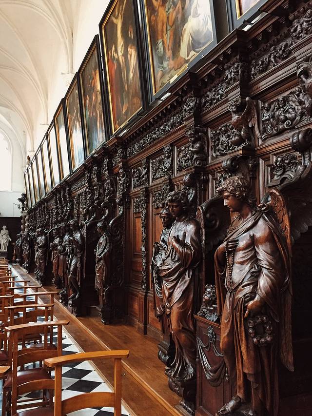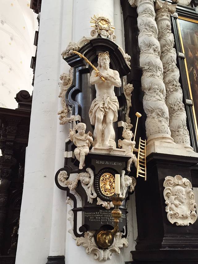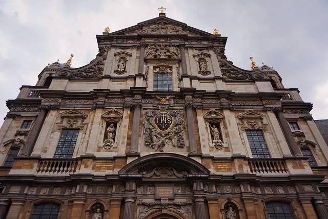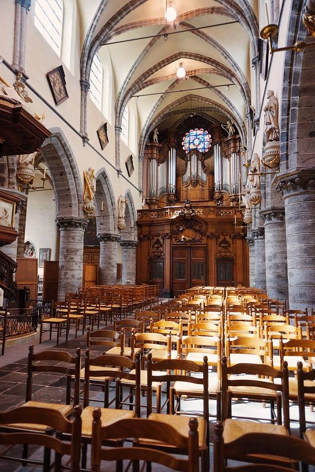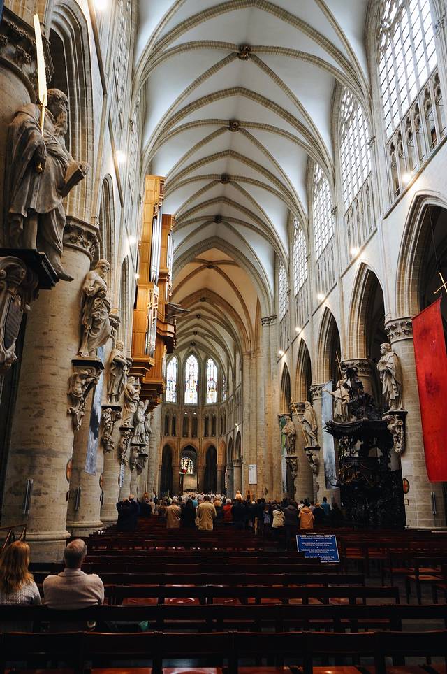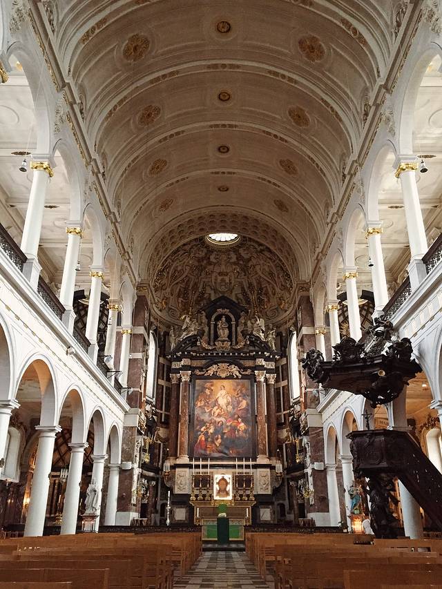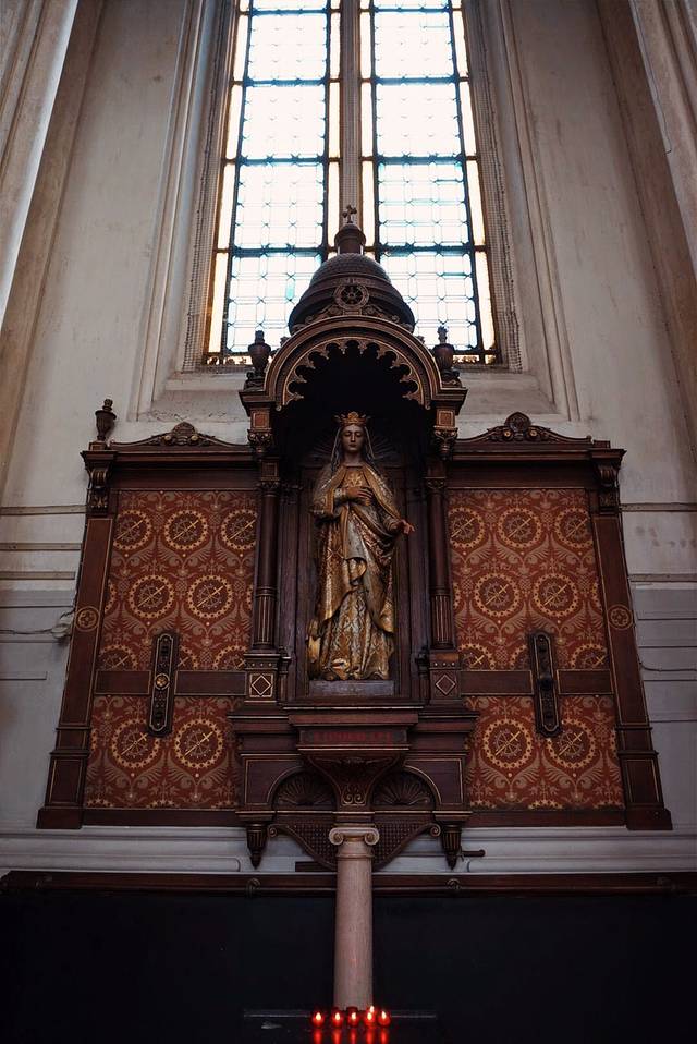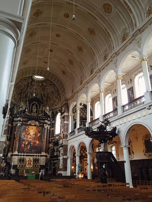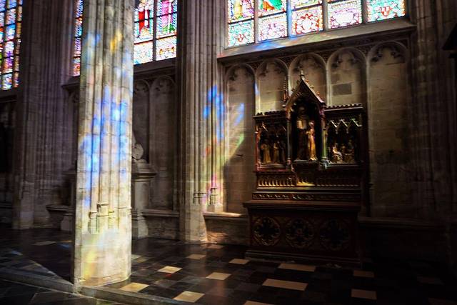 到了下午,布鲁塞尔终于阴转晴,温暖的太阳投射过彩绘玻璃窗,在教堂里投下了色彩斑斓的光点