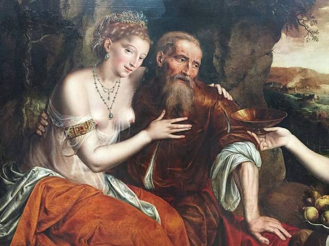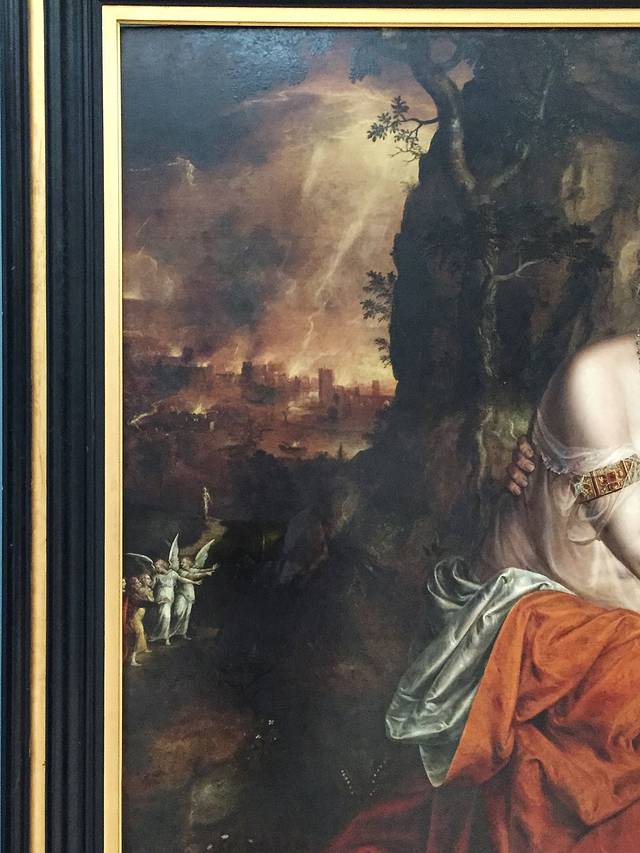 在画的左上角,能清晰的看到被雷电和天火毁灭的堕落之城索多玛。在小路上,有个石化的人行,那就是罗德的妻子。而更近处,则是毁灭索多玛城的天使。
