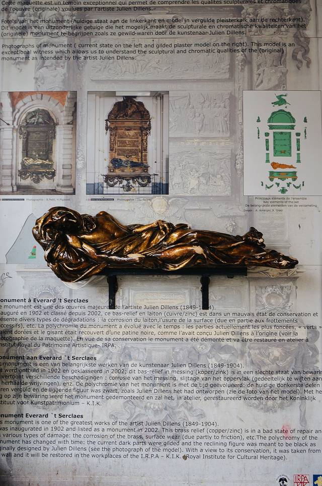 这座卧像,是比利时民族英雄爱多瓦尔多·塞格拉斯(Everard t'Serclaes)临终前的铜像。14世纪的时候,反对贵族的塞格拉斯在一次战争中被砍下一条腿和舌头,最后死在现在铜像安置的这栋大楼的位置。传说触摸他的身体会带来财富和好运,铜像本是青绿色,因为人们的触摸现在变成了金铜色。