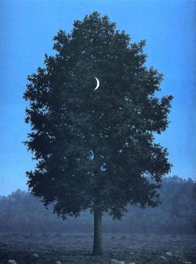 这种反常的奇怪的置景方式,反复出现在马格里特的画作中,并渐渐成为了他的招牌性的表达方式。比如下这个挂在树上的一弯星月。