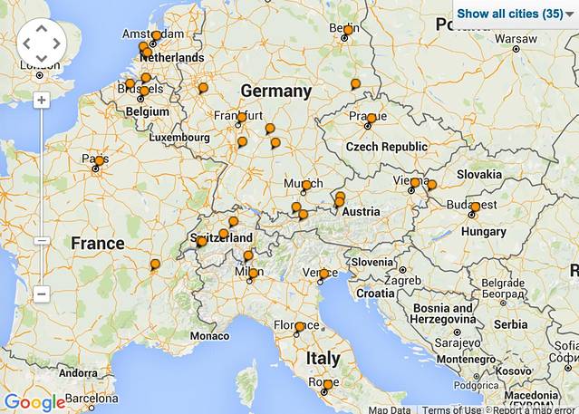 慕尼黑 -> 萨尔茨堡 -> Berchtesgaden -> Garmisch-Partenkirchen -> 因斯布鲁克 -> 纳德林根 -> 陶伯河畔的罗滕堡 -> 维尔茨堡 -> 法兰克福 -> 海德堡 -> 科隆 -> 柏林 -> 德累斯顿 -> 维也纳