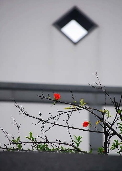 黑白灰基调里,红色的石榴花,相得益彰,惊鸿一瞥!