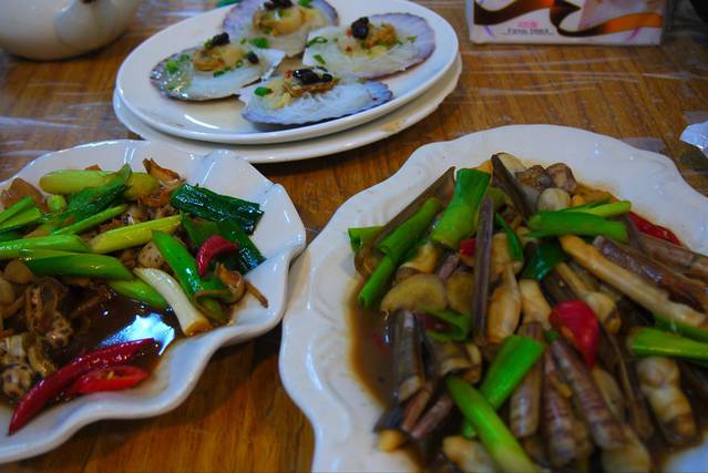 清蒸扇贝、烧红蛏、烧旺螺