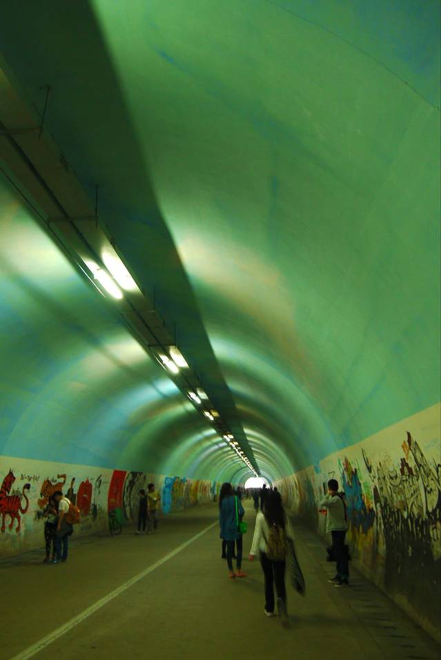 隧道很长,里面很多不错的作品,但我最喜欢的还是学生从公寓区骑着自行车穿梭在长长的隧道里赶去上课的感觉。