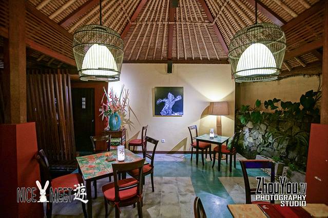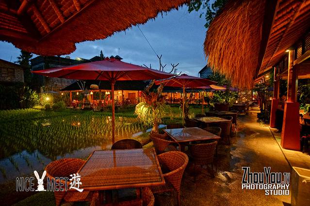 开放式的就餐环境,巴厘岛风情的庭院,在凉亭中用餐,身旁就是稻田,晚风蛙鸣,令人感到十分惬意。
