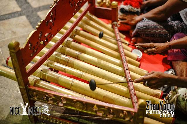 印尼当地特色乐器,由长短不一的竹筒制成,用两个带有橡胶头的木棍敲打而发出响声。
