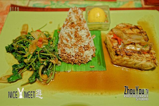 Be tongkol Sambal Matah,烤鱼块和炒时蔬套餐,味道还不错。