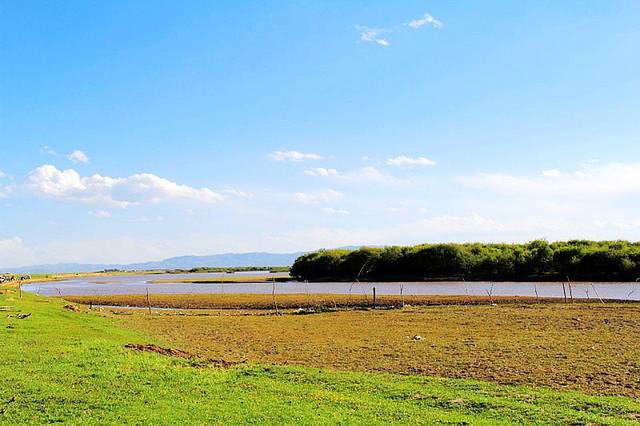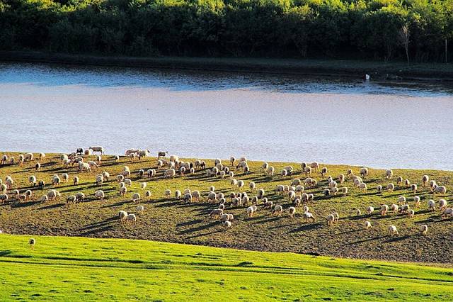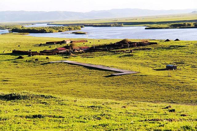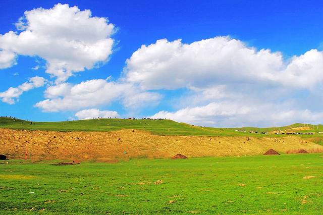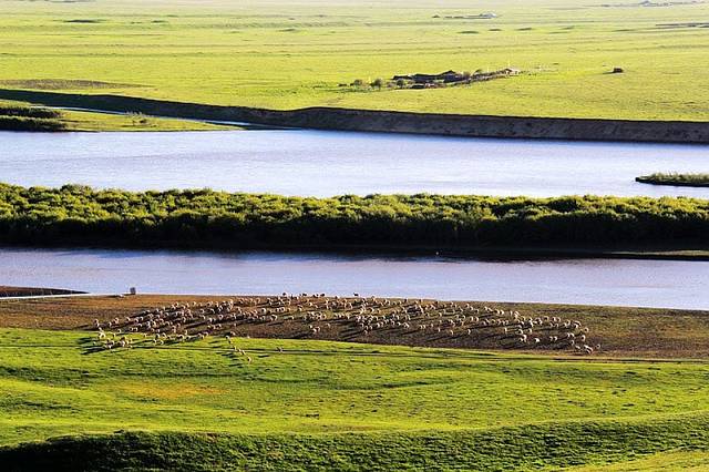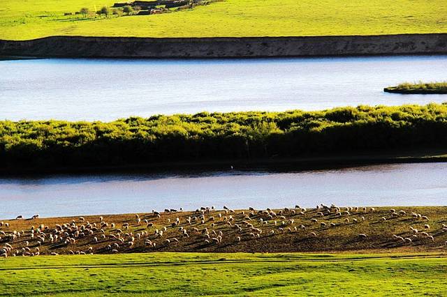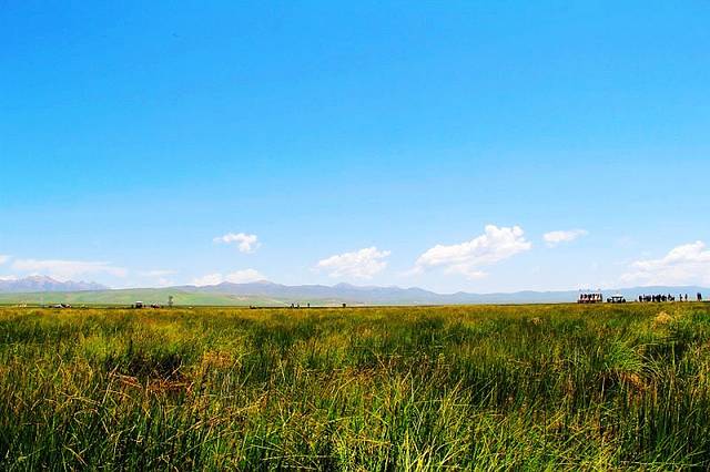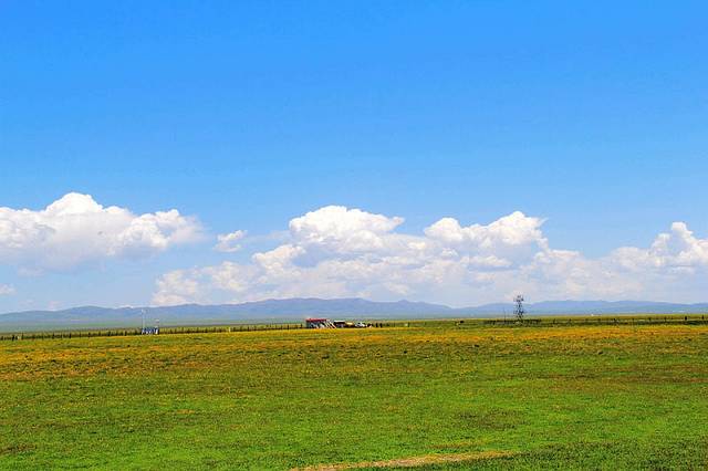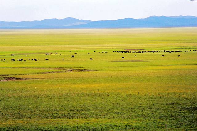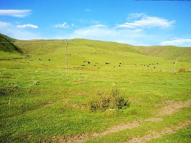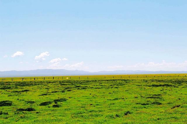 广阔的热尔草原一片碧绿,来到草原上,你的心也会随草原而开阔。放眼望去,除了绿色还是绿色,偶尔有一片星星点点的白色在移动,反而为草原更增加了一些生动。