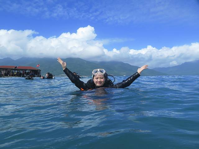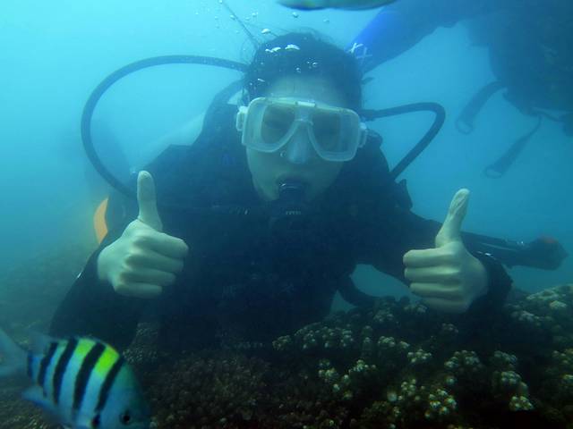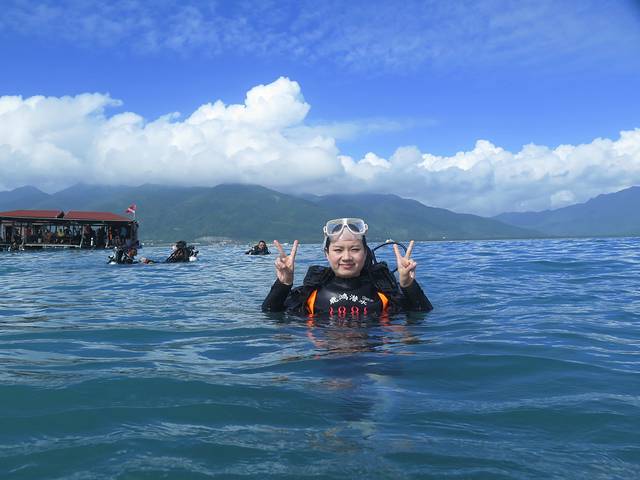 有人告诉我们,去了蜈支洲,就不用去分界洲了,因为我们去蜈支洲的时候没有报名游玩项目,去分界洲报名的户外一日游也是为了去玩一些项目(深潜,浮潜,沙滩写真,海钓,海狮海豚表演),总体还是不错的,更体验了一把潜水,教练都会亲自教的,不会游泳也没事,先去尝试一下浮潜然后再去深潜,感觉还是很不错的,我们还在深潜里拍了一些照片,留着纪念,深潜的时候我的耳朵是比较疼的,不知道是不是跟小时候得过中耳炎有关,和我一起去的小伙伴她们倒是没多大感觉。一天的项目也就是我上面所提到的的那几个,我非常喜欢新的体验,所以玩的还是蛮开心的,注意一点,就是尽量拿着洗发露,毛巾,泳衣,擦脸的。返程回到家后,我们又吃了一个自助餐,大东海大菠萝对面的二楼,有个自助餐,味道还是不错的,因为用的团购,原本78的我们每人只用了30元,真是超级划算哇。还有一定要吃多少拿多少,我们因为浪费还被罚了十元呢。