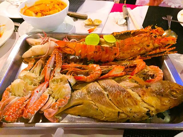 我们来了份海鲜套餐,菠萝饭,两份意面,柠檬蒸鱼,2瓶啤酒,泰式酸鱼汤。一共3179铢。饥肠辘辘的大家伙儿直接没等菜上齐就开动了,害得我照片都没拍下来放攻略上说。