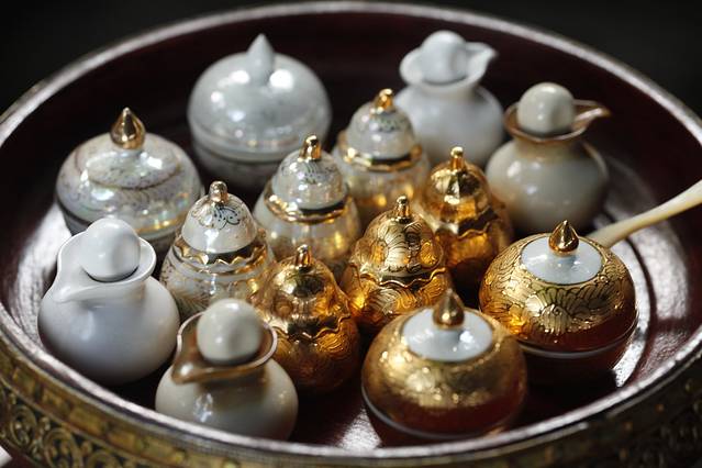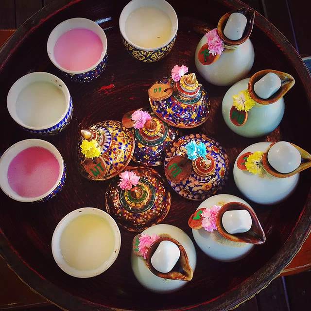 我们仨选择的是2小时的精油磨皮按摩,2700铢/人。这精致的小瓷瓶里装的是各种草本霜和纯粹精油,可以自己选择搭配。之后温柔的泰女姐姐会奉上花草茶之类的凉茶,然后让我们把身上的贵重物品都取下来放在保险箱里再换衣服去。