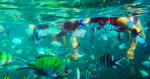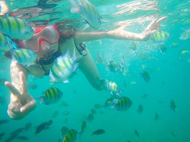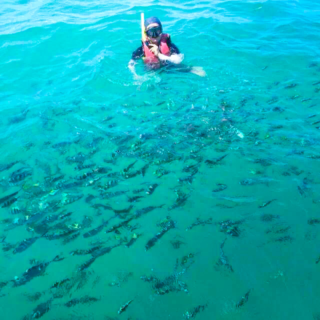 鱼斑岛有别于苏梅龟岛的久负盛名,这个在苏梅北端的小岛鲜为人知,因此这里的热带小鱼更是触手可摸。带上船员们分发的潜水镜,才一下水就被活泼不怕生的小鱼儿紧紧包围,像是夹道欢迎这庞然大物,又像是好奇宝宝们来参观新生物。水里简直一片闹腾。