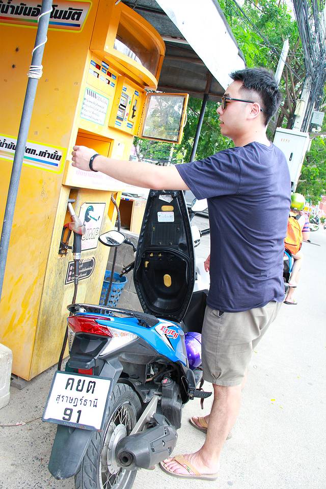 因为摩托在泰国是超级普遍的交通工具,所以加油的话不用去加油站。在街边就有那种投币式的迷你自助加油站噢~