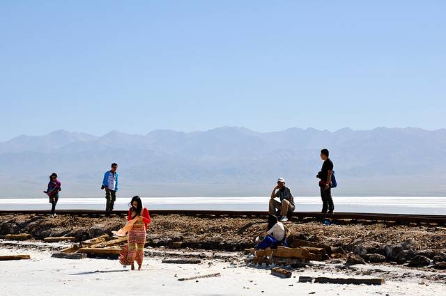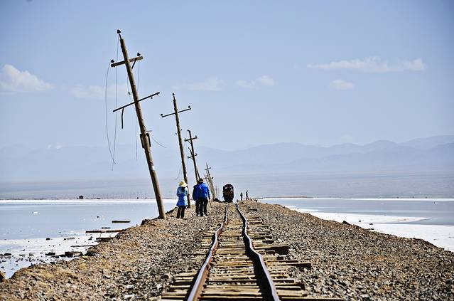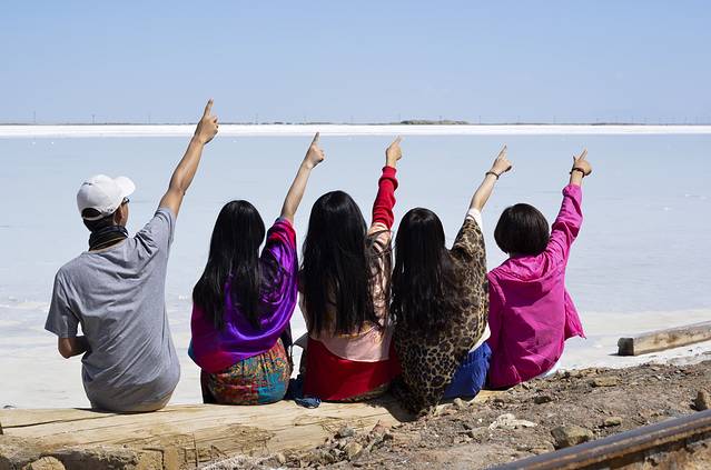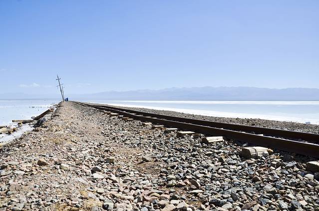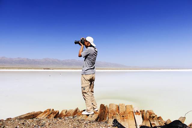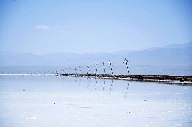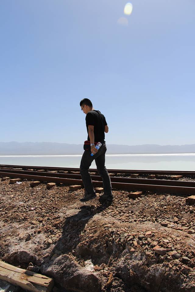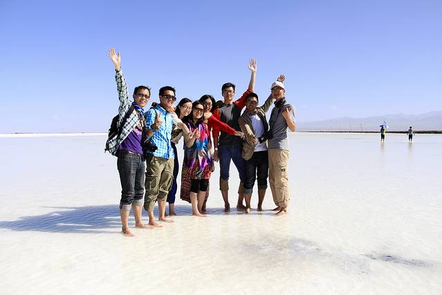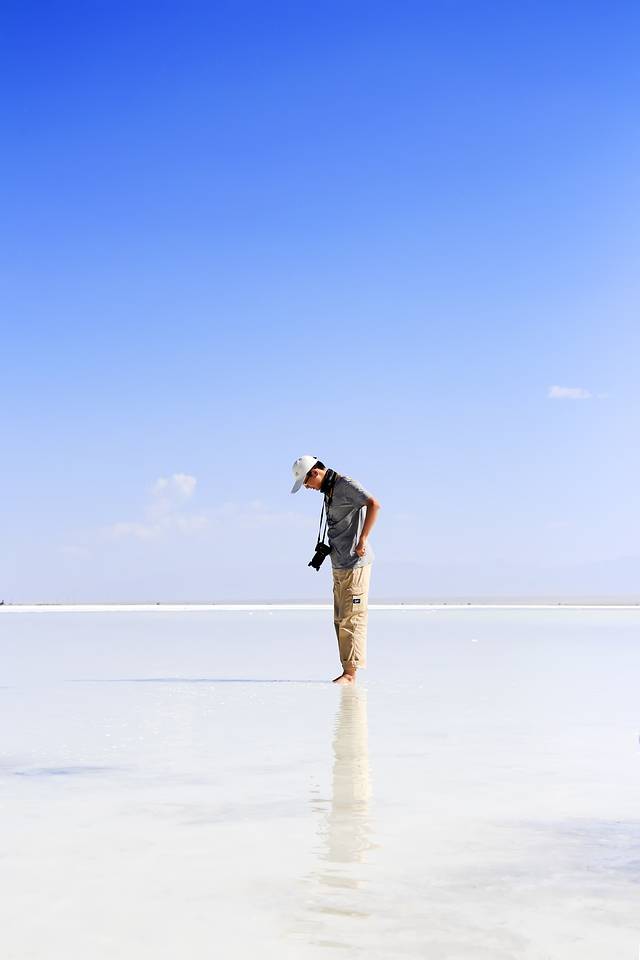 下午左右我们来到茶卡盐湖。早在旅行之前就知道玻利维亚的盐湖很出名,天空之镜的感觉,来到这里自然也希望能观得此景。可能是来的时间不太好吧,大中午阳光比较厉害,都是白茫茫一片,不过还是有几张特别好看的照片的。天地一色的景象居然真的存在,一行人脱掉鞋子在盐湖中玩耍。