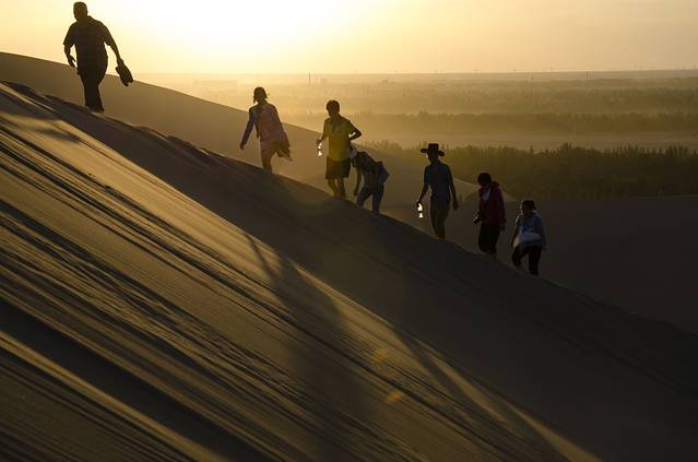 当夕阳没入鸣沙山后面时,一切也都似乎要结束了,但事实并非如此。天气的凉爽似乎让被燥热气浪冲击的人群焕发出新的活力,处处嬉戏打闹的场景,玩沙的快乐让他们找回了童心。我们一行三人也下山奔往月牙泉。在下山的过程中,更是乐趣无穷,见到有人奔跑着下山着实震惊,于是也尝试了起来,一发不可收拾的一口气跑到了山下,在沙丘奔跑的快乐油然而生,让我体验到另一种快乐。