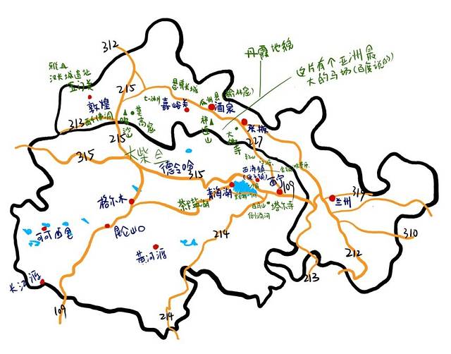 前期的准备工作就是要选择走什么线路,找驴友拼车,安排住宿。甘肃青海两地可玩的地方很多,本次旅行所走的线路是俗称的青海湖大环线,是一条很经典也很成熟的旅行线路。我们的行程如下,整体来说第一天时间比较紧张,剩余几天相对宽松,驴友可参考。附网友手绘地图一张。