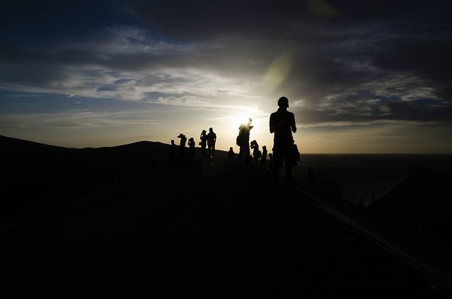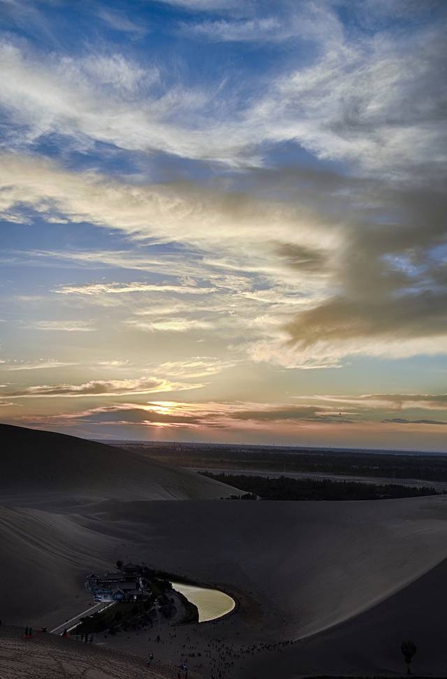 黄昏将至,日落也如期待的炫丽展现在我们面前。其实日落的景色很久前就领略过,但是特殊的时间特殊的地点总能给特殊的景色赋予特殊的意义。鸣沙山、月牙泉这俩映衬着日落,自然是极致的美。我想我只有去静静欣赏,然后用相机记录。还更有意思的当属那些共同来到此地的驴友,你不曾想象他们的身影映出的轮廓有时另一种独特,剪影的魅力就在此。多些人在艰难的爬山,有些在看相机,有些在摆pose,旅行的快乐挂在笑脸上,从那种简约的轮廓、弧度就能亲自感受到那种愉悦。