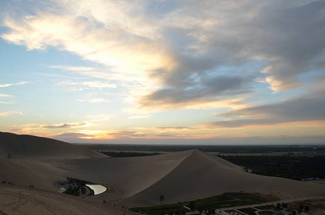 鸣沙山、月牙泉当蜀今天的主角,爬鸣沙山爬到一半时发现月牙泉就在身后,观望了几秒发现月牙泉已经完全人工化了。爬上鸣沙山俯瞰整个月牙泉还是很美的,在鸣沙山等着日落。天空的云还是不错的,可以预料到晚霞有多么炫丽。坐在沙丘上,吹着风,感受着天地的大美,不知还有多少如此静谧的时光,只求珍惜当下宁静的片刻。