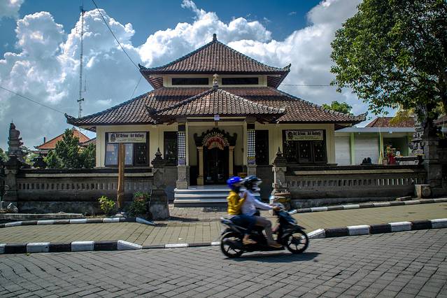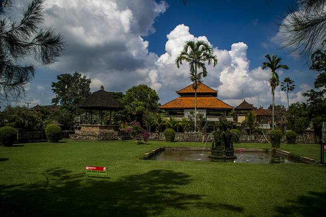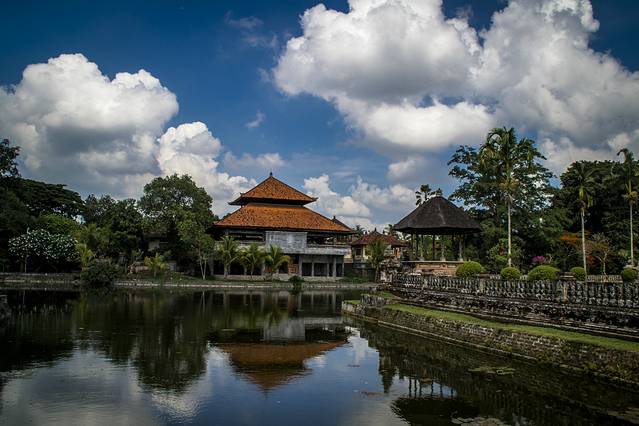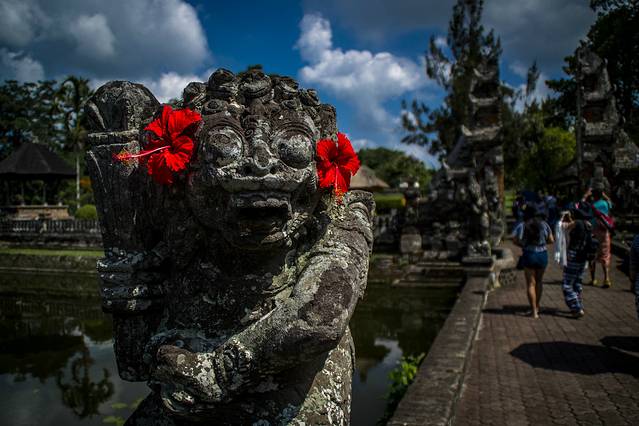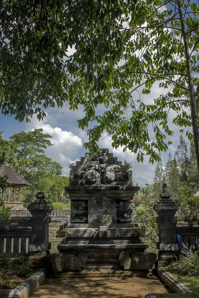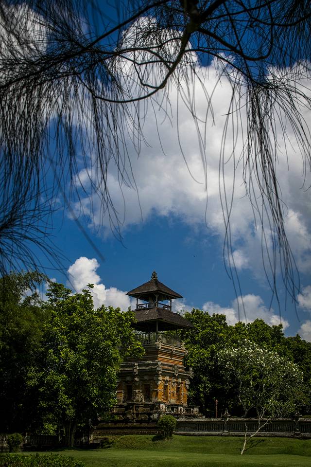 塔曼阿云寺有接近400年的历史了,是巴厘岛第二大寺庙,是孟威王国时代的皇家陵墓和祭坛。和中国的的十三陵相比,这“第二大寺庙”可算是捉襟见肘,除了面积小了很多以外,还少了些那种肉眼可见的庄严盛势。古老的宫殿,茅草顶的高塔和神龛,斑驳着青苔的深橙色城墙下,一池荷花盛开,怎么看,怎么都只能感受到一种宁静得几乎称得上愉悦的气氛。寺庙的正门游客不多。我们缓缓的转了一圈,拍拍照,听听导游的讲解,据说这里不但供奉着孟威王朝29位国王的灵位,还是历代国王加冕的地方。所以这里不但盛着对逝者的哀思,还有对生者的期冀。