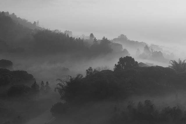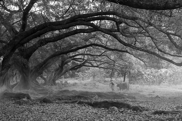 春季天气变幻莫测,日出时乌云密布,即将离开杨家溪时,大榕树突现一束光