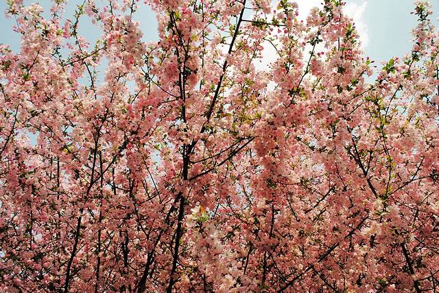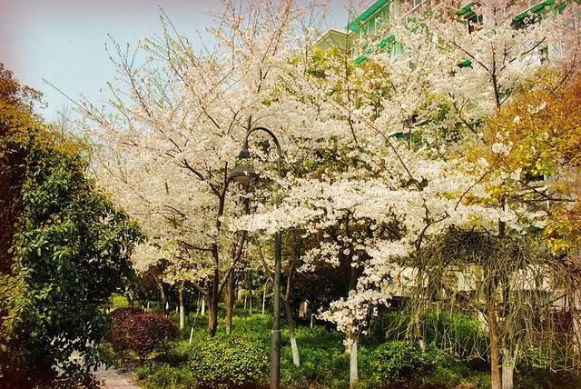 两棵樱花树就把普通的绿化带装扮的美丽动人