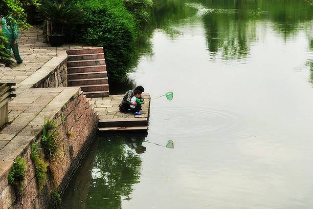 走进雷峰塔前的放生池