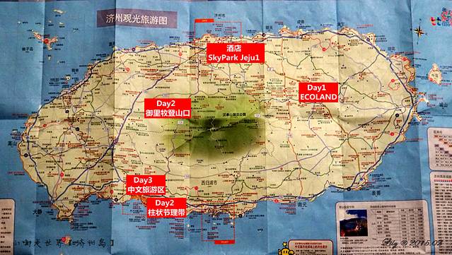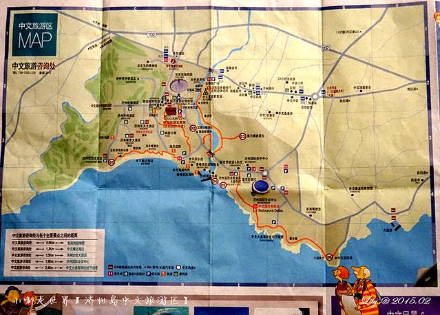 最后一天去中文区的时候拿到一份宝贝地图,回来写游记的时候参考了很多信息。就是这个了,正面济州岛地图、反面是中文旅游区的地图。