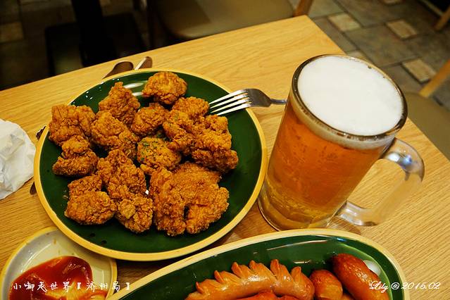 情人节啊,时间尚早,终于可以好好吃顿饭了,在宝健路上溜达,看着像韩餐的餐馆一眼望去都是空空荡荡的没有人,犹豫之下看到了小黄鸡,里边还真坐了几桌人。于是我们的情人节晚餐变成了都教授的啤酒加炸鸡。