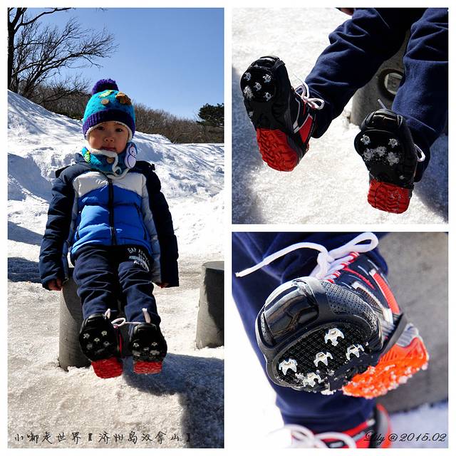 二十分钟走到了登山口,上装备了,看看我们提前准备的冰爪,感谢小马王鼎力支持啊,小朋友的买的最小号还比他的鞋子大几个码。赶紧装备起来准备上山,道路积雪必须得有冰爪把地,才能如履平地不摔跤。进山之后就有大告示提示大家一定要穿冰爪登山。