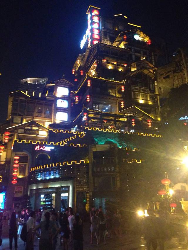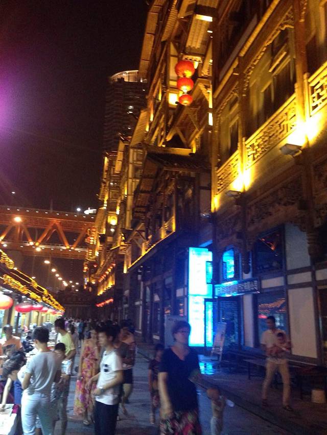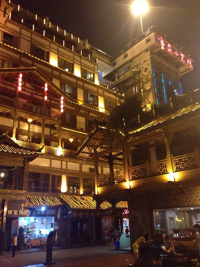 逛完后坐动车直杀重庆,抵达重庆已经是晚上八点多了,先去了我们预定的酒店(翰文大酒店),网上预订打六折五百多一间,设备设施没得说,带免费健身房和游泳池,值得推荐,收拾完行李大伙也饿的不行了,听出租司机说解放碑附近有小吃街,那就去呗。