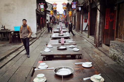 古时,江南小镇以“百户为坊,万户为市”,据《乌镇志》记载,明时乌镇共有7坊,时至民国已增至47坊。“坊”是乌镇的居民区单位,同时也组成了乌镇人特殊的社会团体,平日里走街坊,串邻里互增感情,而逢新春佳节,有钱的大户人家,总是在坊间广开宴席,广邀邻里好友、往来过客,同享年福,街坊邻里们也沿街摆上桌椅,木桌相连,便形成了活色生香的长街宴,当地人又称“坊宴”。