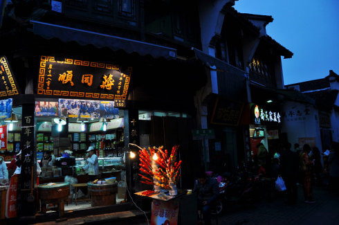 第一天,玩的很尽兴!晚上在西栅的餐馆里吃了点东西,在河上、街上热闹的气氛中,早早休息了!