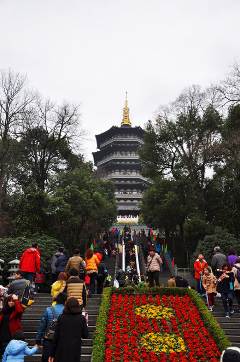 游览完三潭印月,我们坐游船到花港上岸,游览雷峰塔(成人:40/元;1.2米以上儿童:半价/人)。雷峰塔又名“黄妃塔”,位于西湖南岸夕照山的雷峰上,是杭州旅游的热门景点。