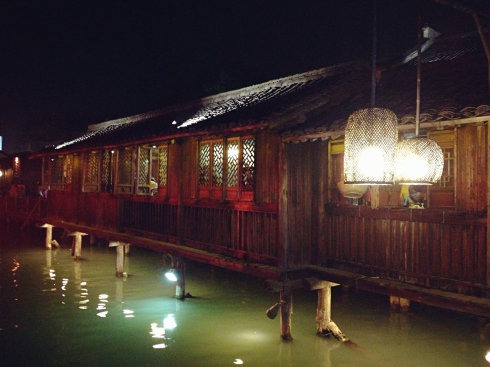 我们入住的民宿紧挨着人称“水市口”的水上市场,整个水域面积约3400平方米,被一条东西走向的木栈桥一分为二,木栈桥与景行桥隔西市河相望,水域东西两侧临河都建有水阁。入夜后的“水市口”,更是让人有些醉了!