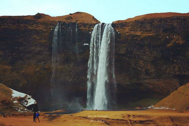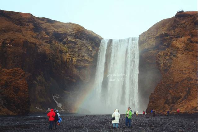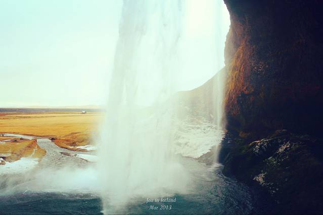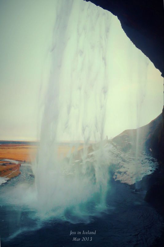 绕到Seljalandsfoss waterfall背后看外面的水帘和平原,视野辽阔,据说这是夜观极光的极佳地点之一,想象透过瀑布看北极光的情景,一定很梦幻