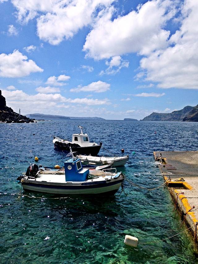 一切收拾妥当后,便要出发和前一天早我们一个航班顺利到达圣岛的小伙伴们集合啦!今天的目标是,圣岛环岛游!听起来非常高大上,其实这个小岛从最顶端穿到最底端不过1个小时左右,哈哈!第一站,一定便是最最著名的国家地理杂志上的蓝顶教堂,这也是圣托里尼最为著名的蓝顶教堂,但当地人民并没有将其作为一个旅游景点,并不好找,因为如果你从山下找,它会被前方的围墙和钟铃完全遮挡,最方便的方法便是在地图上定位Santorini Palace酒店,酒店的标志非常明显位于一个半坡上,冲着酒店继续沿上坡路前进,面前会出现岔路口,沿着右手边的上坡路继续走上去,会看到一个白色的长长的矮墙,还有一个蓝色的小门,门边上写着Apartments Gbay。走到墙边往下看,蓝顶教堂便豁然呈现在眼前了。真的是太美了,那份美所给你带来的震撼,远远超出你在图片中看到的感受。爱琴海的蓝,映衬着和谐的白色教堂,蓝顶上的十字架,诉说着和平与永恒,看着它,仿佛时间在瞬间静止,让你可以就这样默默地欣赏他,很久,很久…