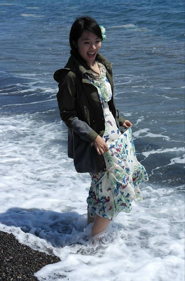 与其说是黑沙滩,不如说是黑石滩,整片海域都是由黑色的火山石组成,靠近岸的部分是大块黑石,靠近海的部分是细小的碎石,所有的石头在海水的无数次冲刷后,都已失去了曾经的锋芒,踩上去又滑又凉,来这里说什么也要踩踩爱琴海的水,感受一下这里温柔的清凉!湿湿的脚丫被裹上了厚厚一层小小的黑碎石,但当你把小石头抖掉后,你会发现脚底非常干净,完全不会出现踩完沙滩后留下细沙和灰尘的情况,真的是好干净!