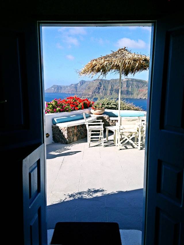 伊亚位于圣岛的最西北部,是圣岛欣赏日落最好的地方,在这里你可以欣赏到全世界最美的日落。而我们的酒店位于伊亚的最顶端,前方没有任何视线阻挡,景致更是堪称完美,房间内还配有精致的小厨房,所有餐具厨具一应俱全,BIBO君看后便很有当大厨的冲动,随即将送到房间的早餐面包火腿用香香的黄油煎烤了一番,两个人香得都顾不过来说话了!!酒店房间外的精致真的很美,每一个房间外都有独立的观景平台,保证在休息的过程中不被他人打扰,吃饱喝足的TT便开始各种照相啦!!